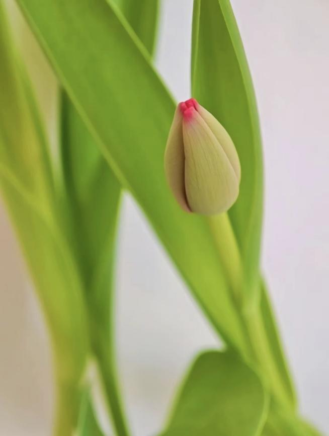 经过一段时间的精心培育,郁金香终于开花了。第三张图片捕捉到了郁金香含苞待放的瞬间。花苞呈现出一种淡淡的粉色,花瓣紧紧地包裹在一起,仿佛在酝酿着一场盛大的绽放。花苞旁边的叶子已经长得非常茂盛,它们像忠诚的卫士一样守护着即将盛开的花朵。