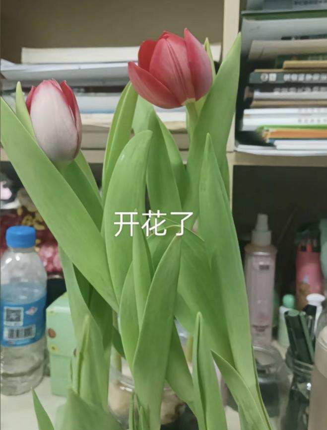最后一张图片是郁金香完全盛开的模样,花朵绽放得十分艳丽,红色的花瓣娇艳欲滴,绿色的叶子作为背景将花朵衬托得更加美丽。“开花了”两个字直白地表达出了这一阶段的喜悦之情。此时的郁金香不仅仅是一株植物,更是一件大自然精心雕琢的艺术品。