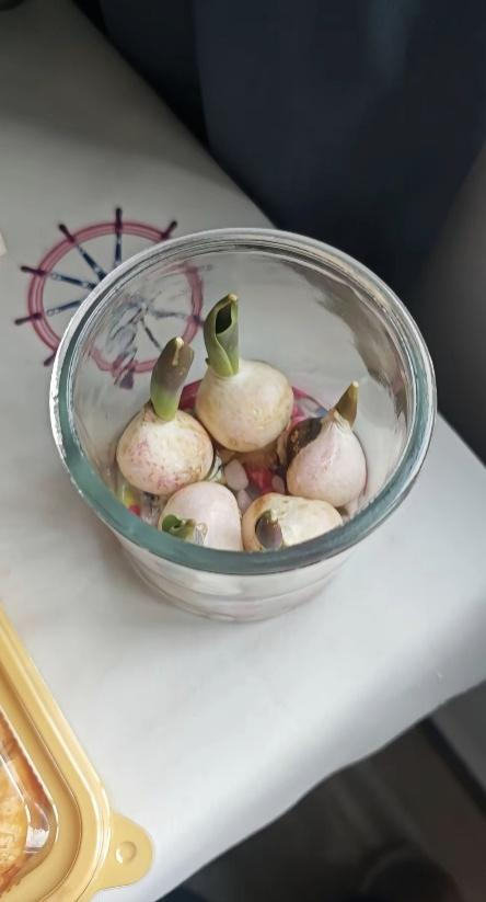 在水培郁金香的最初阶段,我将郁金香种球放在透明的玻璃容器中,加入适量的水,只让种球底部接触到水面。从第一张图片可以看到,种球们静静地待在容器里,有的已经微微露出了嫩绿的小芽,就像一个个刚刚睡醒的小精灵,正在伸着懒腰,准备迎接新的世界。这个时候的种球表皮还略带一些粉色和白色的纹路,看起来十分可爱。