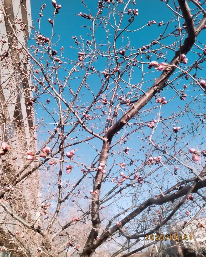 刚开学时便发现学校里有好多桃树,彼时它只是一截光秃秃的枝干,灰褐色的树皮皲裂着,像老人干枯的手。我疑心它能否活过那个寒冬。三月中旬,寒气尚在砖缝里蜷缩着,桃枝上却已鼓起了一个个暗红色的小包。起初极不显眼,渐渐膨胀起来,像树皮下藏着无数个秘密,随时要迸发出来。