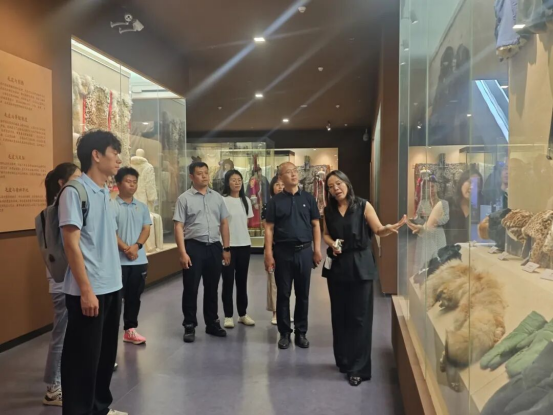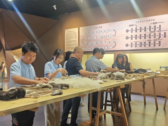 乡村振兴既要守好“文化魂”,也要激活“产业力”。宣讲结束后,团队师生来到全球首个毛皮文化专题博物馆——阳原毛皮文化博物馆开展深度调研。阳原毛皮文化可追溯至旧石器时代,人类祖先已利用兽皮缝制衣物。从新石器时代的骨针到智能数控机床,从珍贵的雪豹标本到现代时装周的获奖作品,这座文化宝库生动诠释了阳原毛皮产业“执古之道以御今之有”的智慧。博物馆集中展示了阳原作为“毛毛匠之乡”的万年传承史:在参观过程中,团队成员特别关注传统"硝染工艺"与现代纳米技术的融合创新,为产业升级寻找学术支点。这种古今融合正是毛毛匠精神的延续——当代传承人将“细详”特质转化为量化标准(如馆长刘峻峰牵头制定《毛皮碎料加工技术规范》省级标准),将“机明”智慧注入产学研合作,推动碎皮工艺与纳米材料结合,提升裘皮功能性。