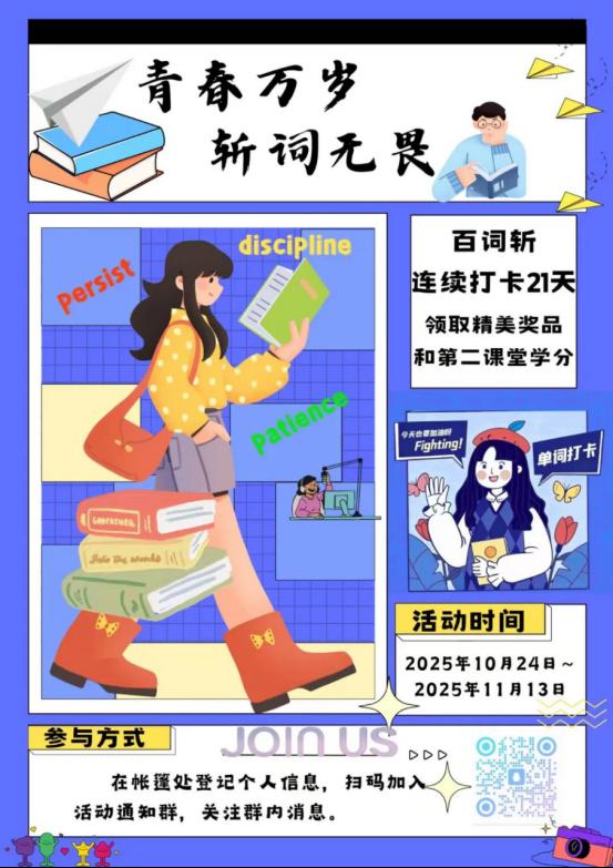 校自律会为了营造良好的学习氛围,特组织“百词斩挑战”,让同学们养成每天背单词的好习惯,提高英语水平,也让同学们在活动中为学风建设添砖加瓦!